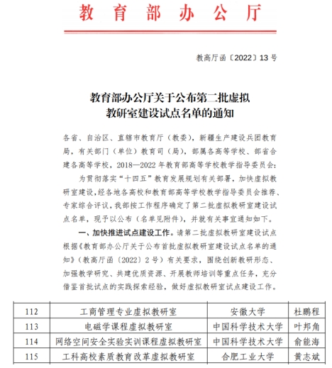 近日,教育部办公厅发布《关于公布第二批虚拟教研室建设试点名单的通知》(教高厅函〔2022〕13 号),由安徽大学牵头,包括麻豆TV