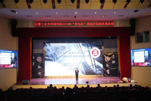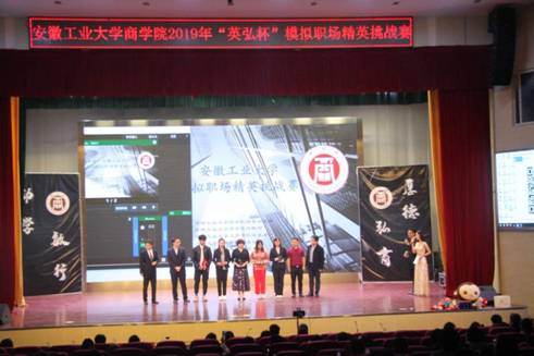 院在秀山校区新大学生活动中心举办2019年“英弘杯”模拟职场精英挑战赛,新城控股集团马鞍山公司总经理李向明、马鞍山徽商银行人力资源主管殷志强、安徽省彤辉科技有限公司兼总经理王鹏、高顿华东区人力资源总监马宁,校学生工作部(处)(大学生就业创业指导中心)赵传刚老师,我院党委副书记、副院长张虎等现场担任评委。