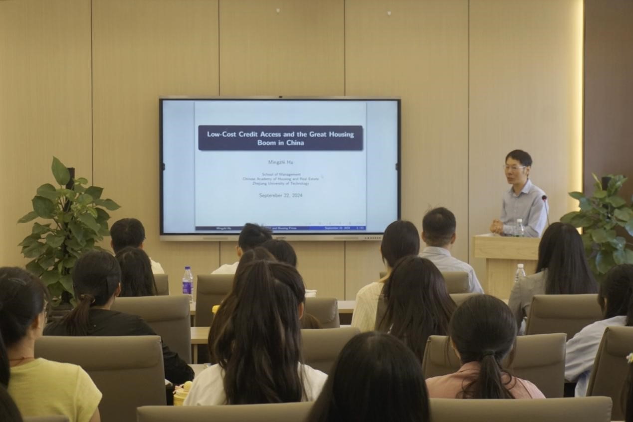 报告中,胡明志老师首先分析了国内外关于低成本信贷的研究背景,并介绍了住房公积金和房价关系的理论模型,利用该模型深入分析了低成本信贷如何促进中国房地产市场的显著增长。他强调,该模型不仅揭示了低成本信贷对房价上涨的推动作用,还深入剖析了住房公积金在刺激住房需求、影响房价方面的内在机制。随后,报告还详细介绍了其研究团队为估算住房公积金改革对房价和住房结构影响所采取的方法和样本选择,通过严谨的实证分析,进一步验证了理论模型的合理性和有效性。最后,胡明志对现场师生提出的问题给予了细致的解答,并进行了深入的探讨与交流。