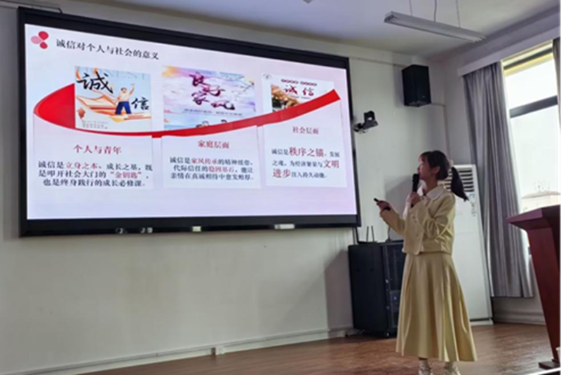在“诚声嘹亮,言践初心”主题演讲比赛上,选手们围绕诚信主题,用真挚情感与生动语言,讲述自身理解感悟,展示良好精神风貌。最终,市241班王丽荣获校一等奖。