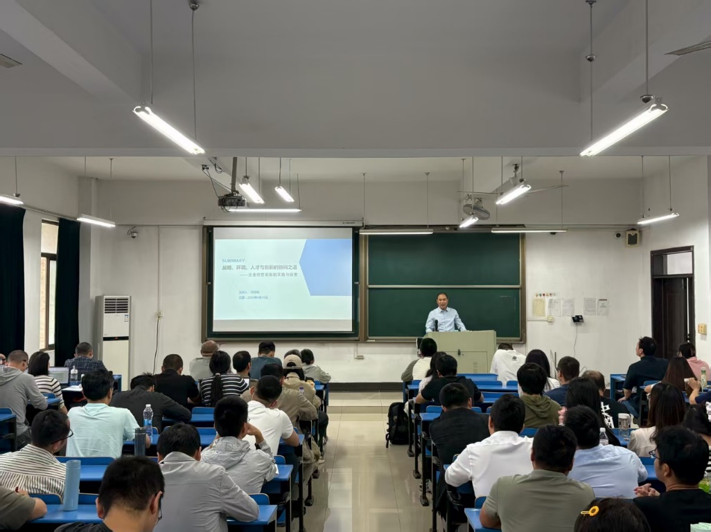报告系统阐述了在当前全球经济格局发生深刻变革的背景下,企业应如何通过战略布局、环境适应、人才建设与创新驱动四大要素的有机协同,推进可持续高质量发展。刘亚辉先生结合其多年高端管理实践经验,借助丰富案例,剖析了企业在复杂多变的市场环境中维系竞争优势的关键机制,为在场师生提供了兼具理论高度与实践深度的精彩内容。