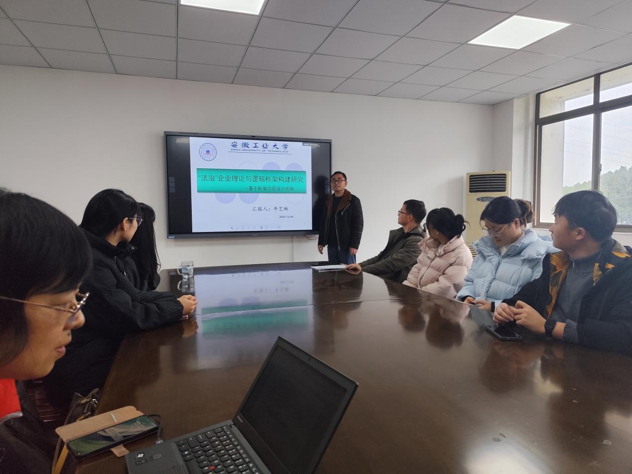 牛艺琳博士以“‘法治’企业理论与逻辑框架构建研究——基于制度顶层设计视角”为题进行了汇报。他指出,当前我国企业存在因牵引机制、动力机制与约束机制不完善而引发的经营管理不善、管理层舞弊频发、治理矛盾突出等问题,这对传统企业治理理论与机制构成严峻挑战,亟需理论创新。研究聚焦企业基本结构,运用案例分析法,对华为公司《华为基本法》《华为治理章程》等制度文本进行梳理、编码与构念提取,提出“法治”企业与企业“宪法”两个核心概念,通过跨学科研究路径,初步构建起“法治”企业理论及其逻辑框架,形成理论闭环。该研究拓展了企业治理的理论边界,丰富了法治与管理学领域的文献,并对内部控制中“权力凌驾”缺陷有所修补,为企业制度变革提供了理论参考。汇报后,与会师生围绕研究内容展开了深入讨论并提出多项建议。