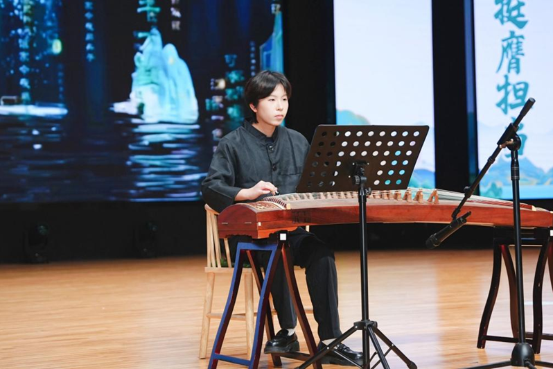 王宇晴围绕民歌艺术的传承脉络展开讲述,并现场清唱经典选段,歌声婉转,意蕴悠长。在朗诵诗歌《春江花月夜》时,会242班汪晨同学以古筝伴奏相和。诵读声清朗舒展,琴音典雅流转,声韵相和,意境交融,为整场演出注入了深厚的艺术感染力与审美层次。