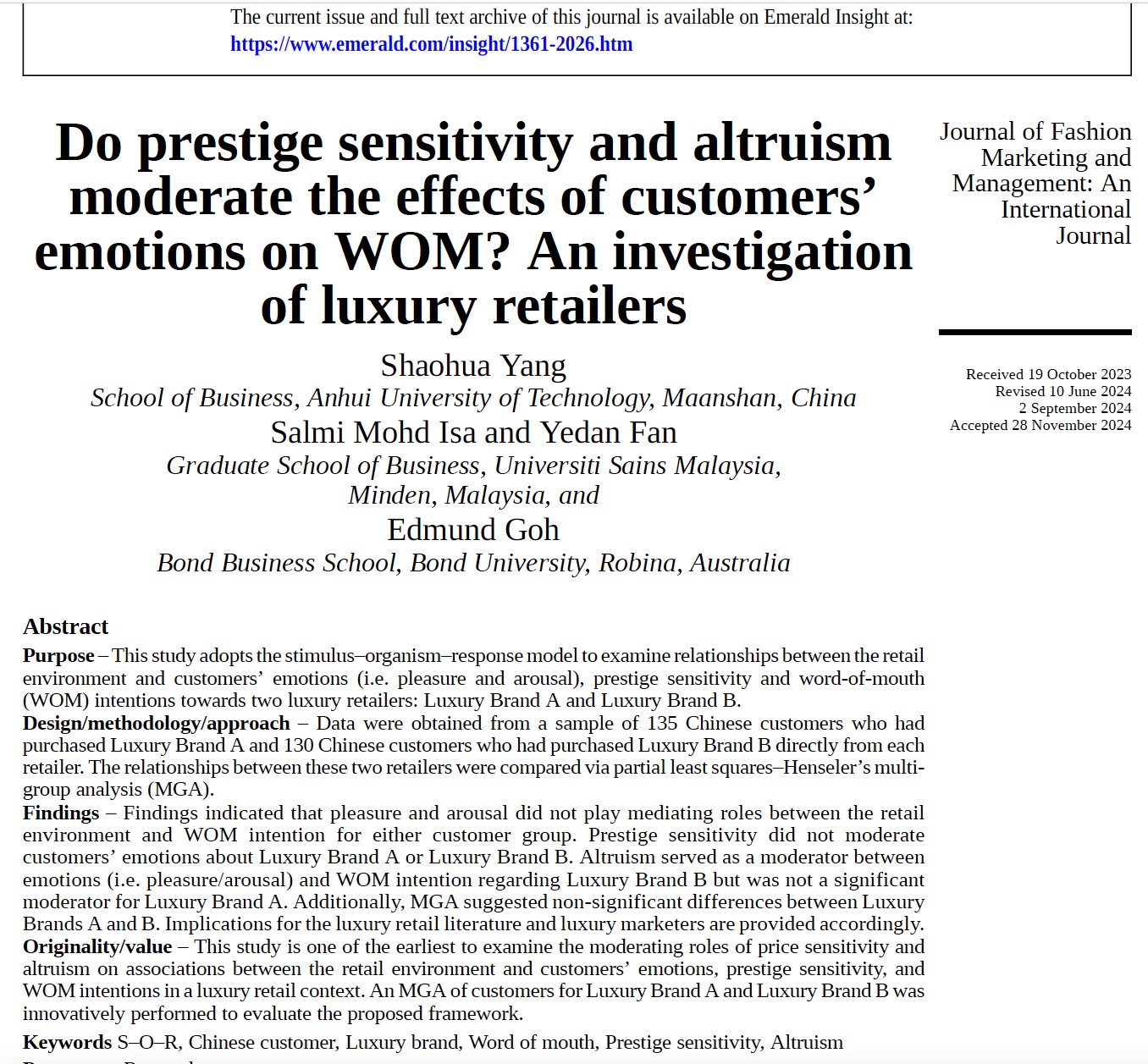 杨少华副教授以第一作者身份在国际知名期刊《Journal of Fashion Marketing and Management》(简称JFMM,中文名《时尚营销与管理杂志》)上发表了一篇题为《Do prestige sensitivity and altruism moderate the effects of customers’ emotions on WOM? An investigation of luxury retailers》的学术论文。合作作者包括马来西亚理科大学的樊烨丹博士和澳大利亚邦德大学的Edmund Goh教授,麻豆TV