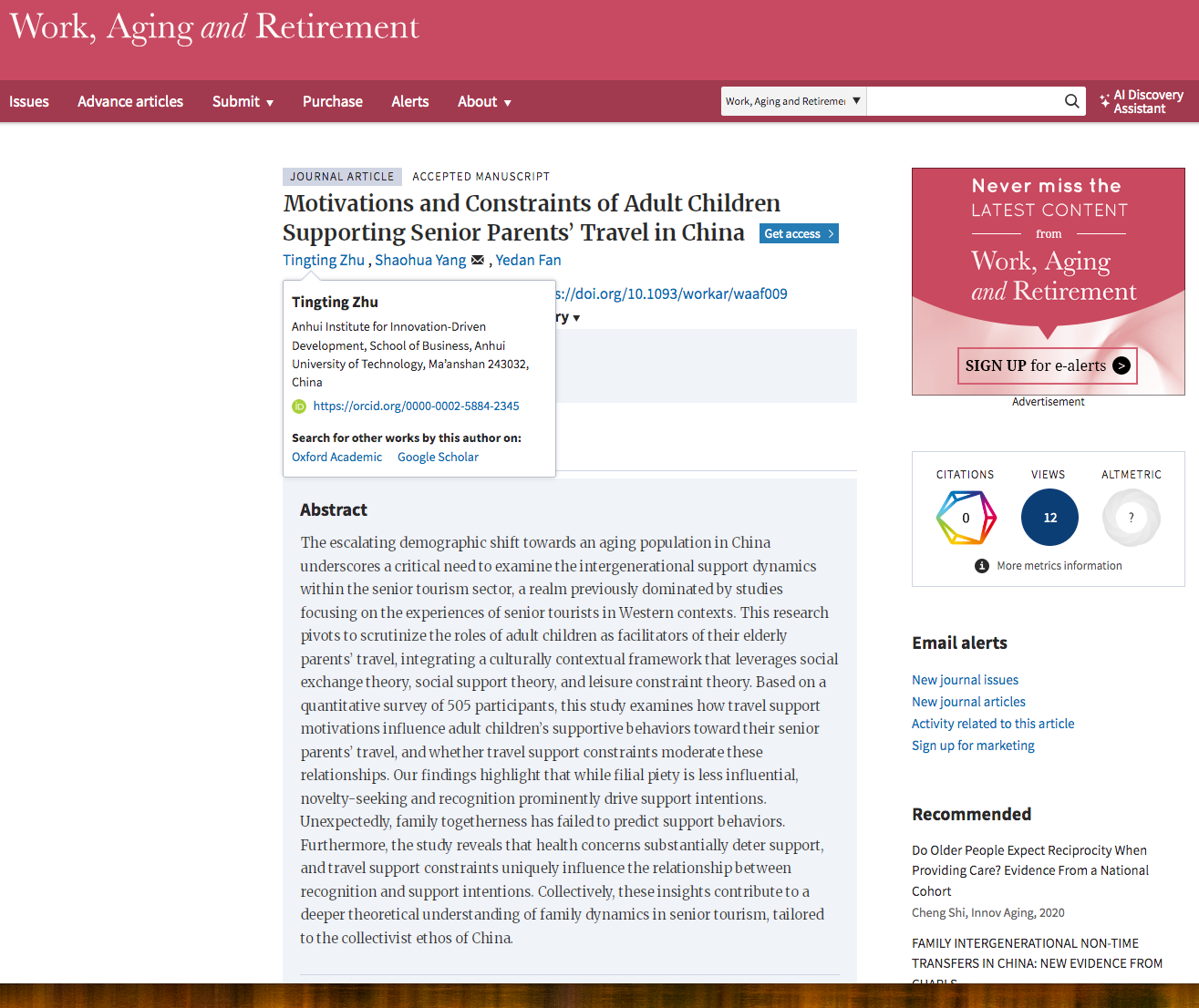 朱婷婷副教授在国际高水平学术期刊《Work, Aging and Retirement》(工作老龄化和退休)发表题为《Motivations and Constraints of Adult Children Supporting Senior Parents’ Travel in China》的研究成果。朱婷婷为第一作者,通讯作者为麻豆TV