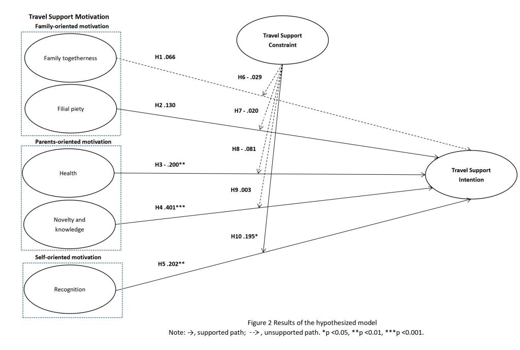 尽管现有关于老年旅游的文献多聚焦于西方背景下老年人自身的旅游行为,但在以集体主义为特征的文化中,如孝道与家庭凝聚力如何影响成年子女支持父母旅游的行为,仍是一个研究不足的领域,尤其是在休闲约束视角下,更是几乎空白。因此,本研究综合运用社会交换理论、社会支持理论与休闲约束理论,构建了一个模型来探讨家庭凝聚力、孝道、健康状况、寻求新奇体验、获得社会认同、旅游支持约束等因素对成年子女支持父母旅游行为的影响机制。基于对505名成年子女的问卷调查,研究发现:尽管孝道的影响力相对较弱,但“寻求新奇体验”与“获得认同”是显著驱动支持意愿的关键因素。出人意料的是,家庭凝聚力并未显著影响其支持行为。此外,健康方面的担忧在很大程度上抑制了子女的支持意愿,而旅游支持约束则在“获得认同”与“支持意愿”之间起到了调节作用。