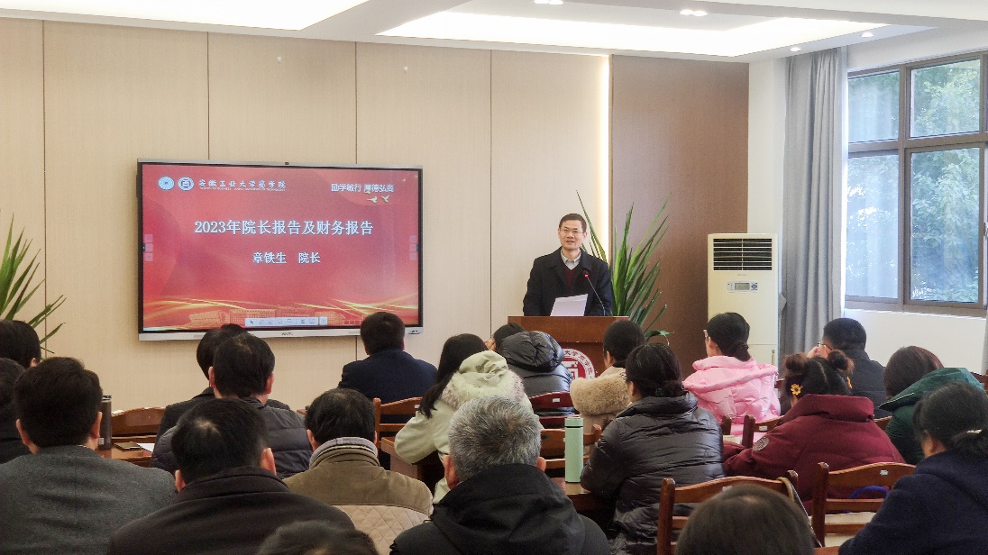 大会在雄壮的国歌声中拉开序幕。院长章铁生向大会作2023年度院长工作报告,报告中指出,2023年学院以习近平新时代中国特色社会主义思想为指导,全面贯彻落实党的二十大精神,紧紧围绕“十四五”事业发展规划和2023年党政工作要点,顺利完成2023年各项工作并取得优秀的成绩。章铁生并作2023年度学院财务报告,学院在“预算编制与执行”、“资金使用与管”、“经费保障与监督”等方面完成了预期工作,所有公共项目收支平衡,财务整体情况良好。