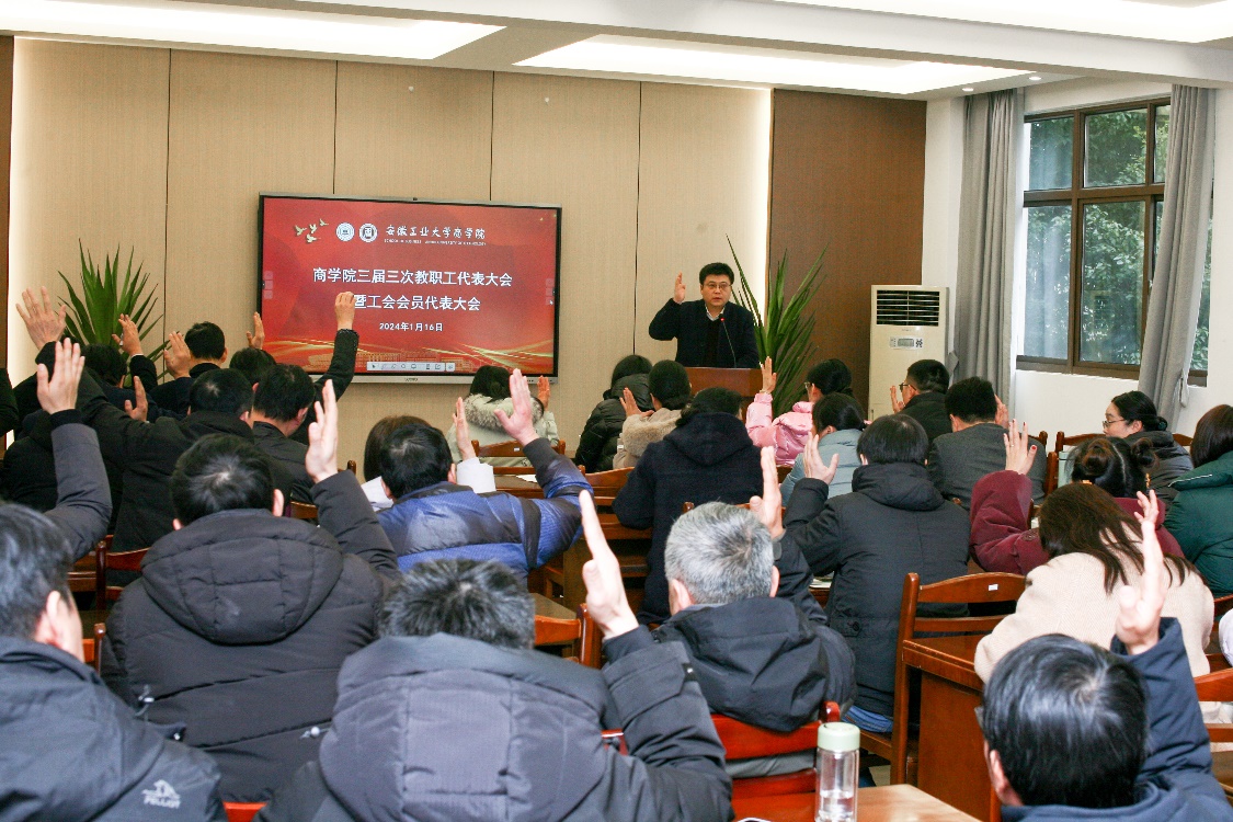三届三次教代会暨工代会在汇文楼B204隆重召开。院党政领导、全体正式代表及列席代表参加会议,会议由院党委副书记、院纪委书记、副院长蒋磊主持。
