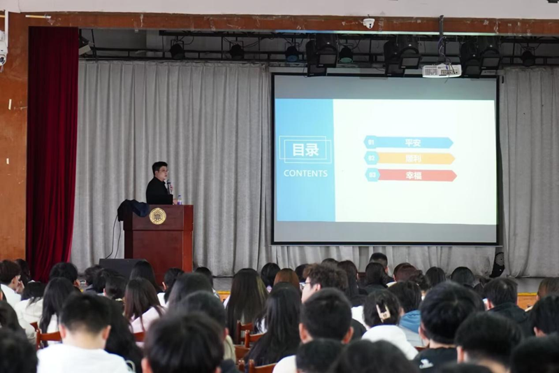 在“平安”方面,他强调了消息畅通的重要性,倡导文明聚餐并特别提醒同学们注意租房安全、晚就寝零汇报安全、防范网络电信诈骗,以及宿舍安全,特别是禁用违规电器,确保校园生活的和谐稳定。在“顺利”方面,蒋磊着重讲解了学业成绩和二课成绩的重要性,以及体测成绩纳入评奖评优机制的新变化,鼓励同学们全面发展,努力提升自己的综合素质,为未来的职业发展打下坚实的基础。最后,在“幸福”方面,蒋磊为同学们分析了当前的就业形势,同时也介绍了麻豆TV