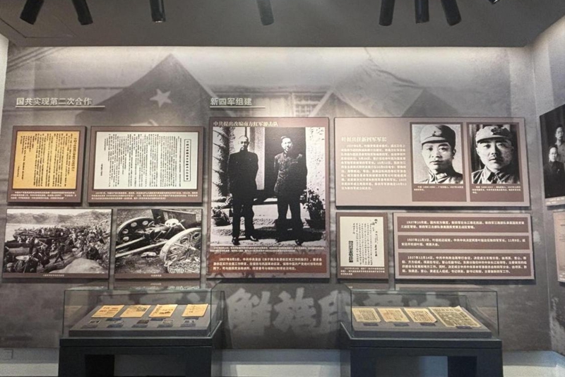 实践队员殷茜彤前往新四军江北指挥部纪念馆参观学习,未达纪念馆便见门口巨大黑色石碑在日光下矗立,沉静却有千钧之重,碑身“新四军江北指挥部纪念馆”鎏金大字熠熠生辉,下方“中华人民共和国国务院二〇一五年八月十三日公布”的标注,让庄重历史感扑面而来;怀着尊敬严肃心情入内,前言展板清晰讲述全民族抗战时期,新四军在党的领导下于大江南北开展敌后抗日斗争,安徽作为重要集结地与指挥中心见证无数壮举,1939年叶挺率部渡江组建江北指挥部,部队东进游击、建立抗日民主政权,为华中战略立下汗马功劳。