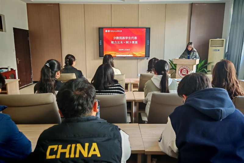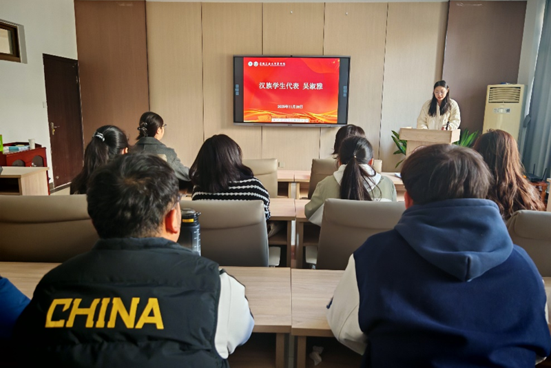 活动在和谐融洽的氛围中拉开帷幕。少数民族学生代表帕力旦木·阿卜莱提和汉族学生代表吴淑雅先后作了发言。他们结合自身在校的学习与生活经历,分享了对于民族团结的理解与感悟,他们的发言真挚动人,展现了麻豆TV